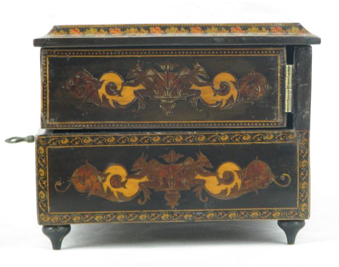 Kasetka na biżuterię zamykana na kluczyk (nie za każdym razem działa - czasami omyka) z drewna, zawiasy wymienione na nowe, pięknie intarsjowana ze środkiem wyklejonym materialem. Stan bardzo dobry. Wymiary 27 cm x 16 cm, wysokość 12,5 cm.